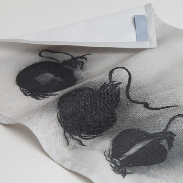 キッチンにアートを。ループのついたキッチンクロス。一人用のテーブルマットにしたり、ループをかけて布巾として使ったり、洗い終わった食器にかけたりと、様々な用途でお使いいただけます。