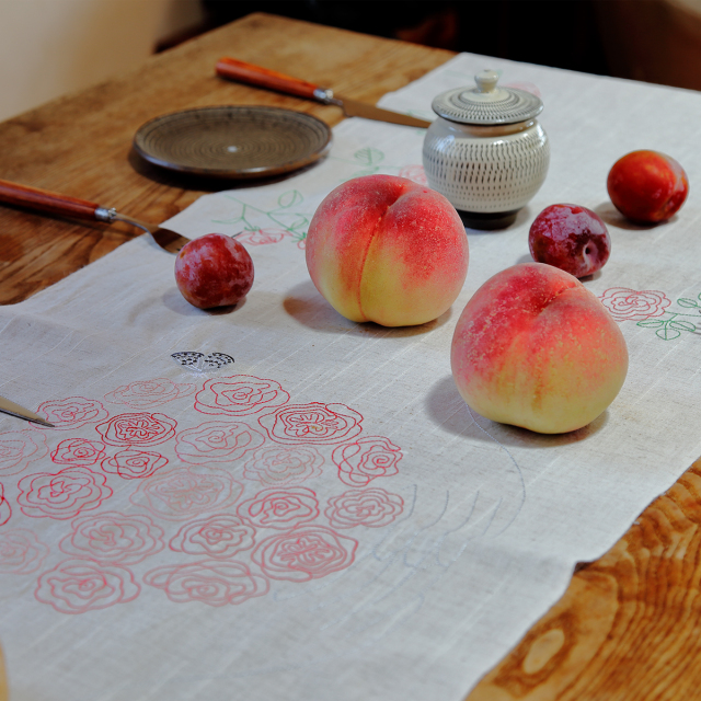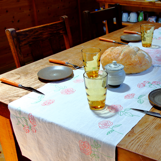 テーブルランナーはテーブルの真ん中を横断させるように敷く、細長い飾り布。反物の小幅を生かして作られています。ワインボトルや大鉢や花などを置くことで、食卓をより美しく華やかに演出することができます。