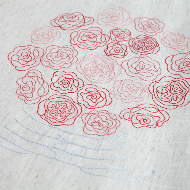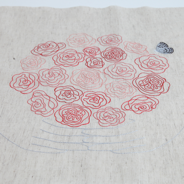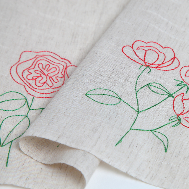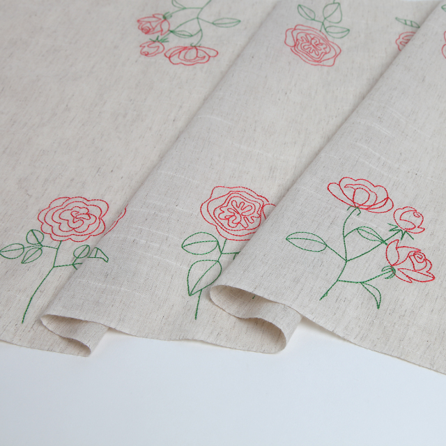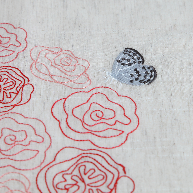 KY06-1097/スラブ糸を織り込んだ雰囲気のある綿麻の和泉和晒に、薔薇の花束を刺繍しました。落ち着いた色合いに、赤やピンクの薔薇がしっとりと映えます。