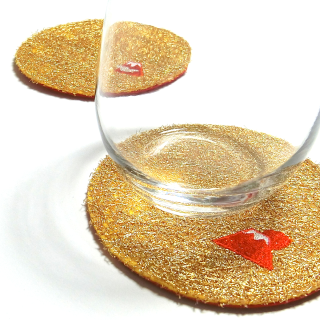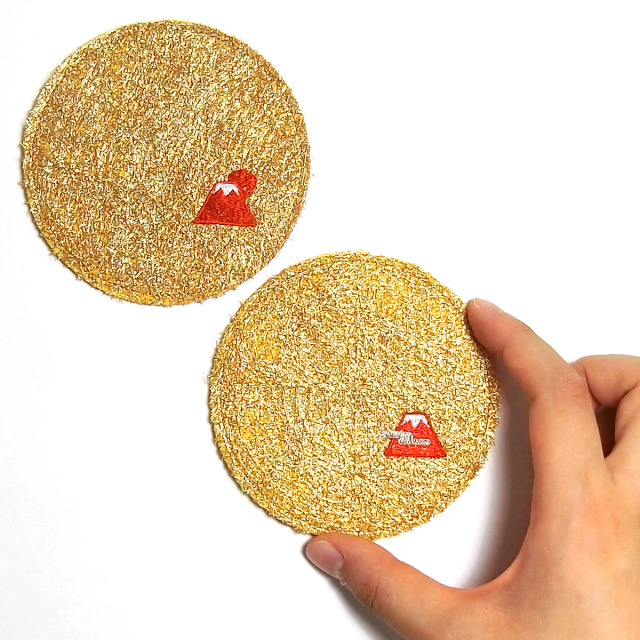 KY09-47/何種類もの金糸を打ち込みコースターに。赤富士のワンポイント。