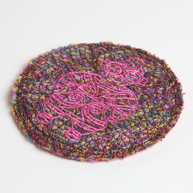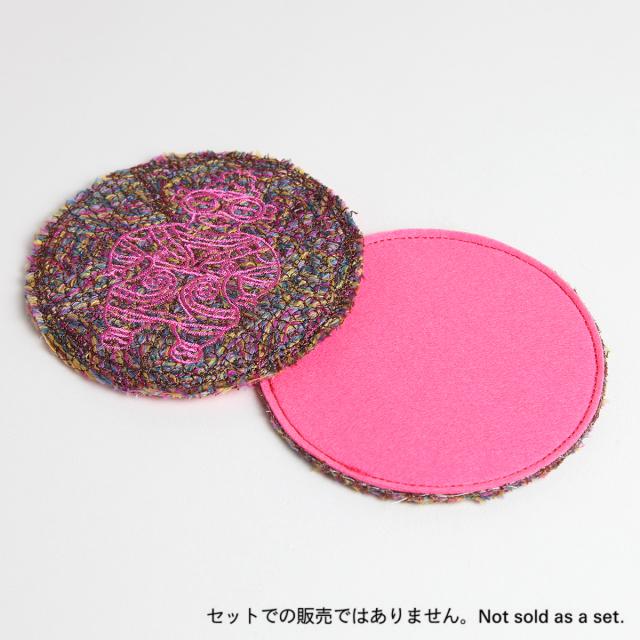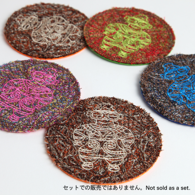 KY09-497P/色とりどりの毛糸を、広島風お好み焼きのように土台に盛り、上からミシン刺繍でたたきこみ、フェルトマットのように仕上げました。仕上げにビビットな色の遮光器土偶を刺繍しました。