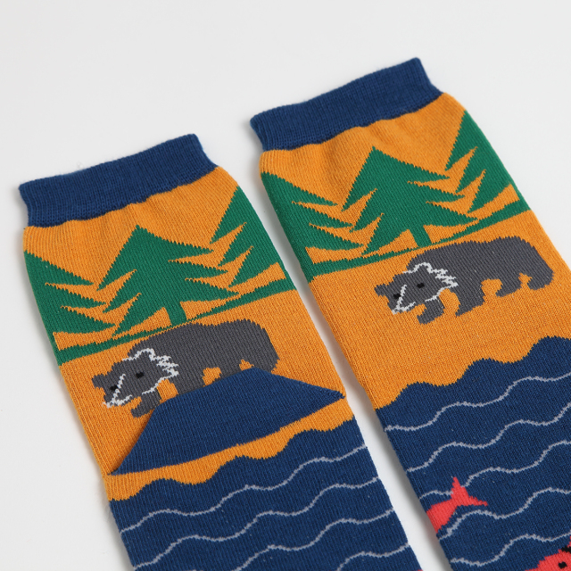 KY18-1068/針葉樹の森のなか。川を遡上するシャケと、腹ごしらえにやってきたクマを描いた足袋ソックス。両足を揃えると1枚の絵になります。