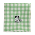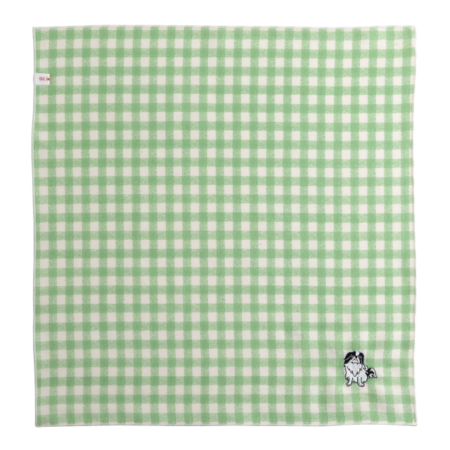 KY28-1163/ポケットに、小さな相棒。やわらかいグリーンギンガムの国産のガーゼハンカチに、ちょこんと座る狆(ちん)を刺しゅうしました。