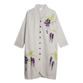 KY29-1079/柔らかな色合いのコットンツイードのロングコートに、藤をチェーンステッチで刺繍しました。背中には月とホトトギスの紋を刺繍しました。さらっと羽織るだけで、上品で華やかな着こなしに。