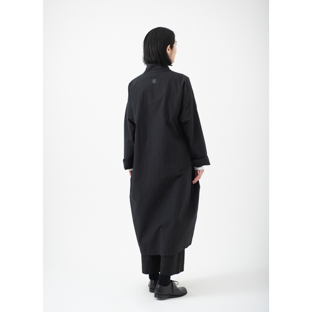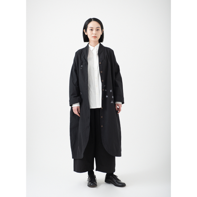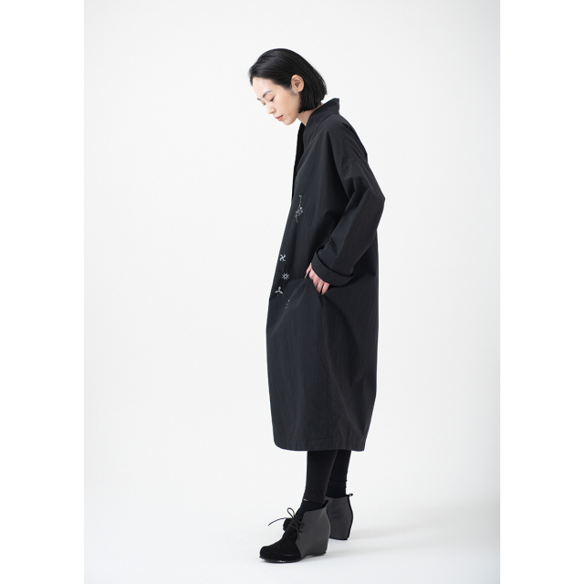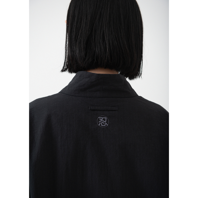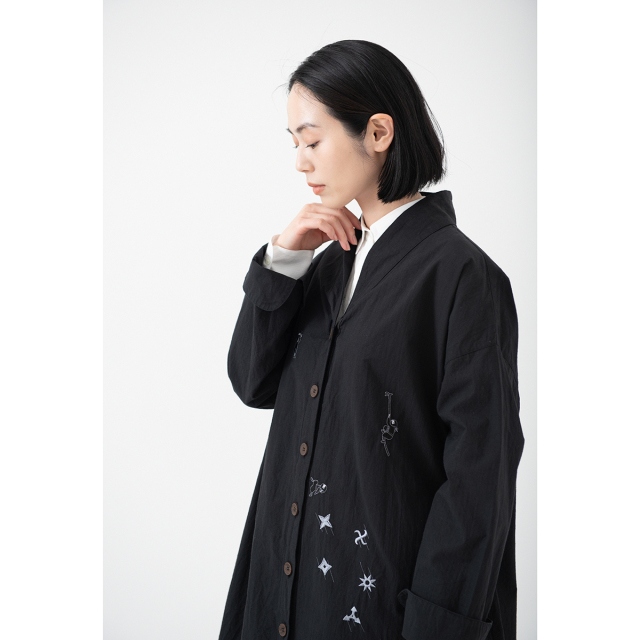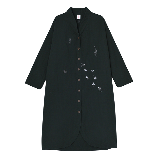 KY29-766/様々な忍術を繰り出す忍者を、飛び柄で刺繍しました。背中には「⚪︎忍」マークを黒糸で刺繍することで隠密感を出しました。シャツ型のワンピースは、前を開けて羽織りにも使えます。生地は、播州織の先染めリップストップです。洗いをかけることで、双糸が膨らみ、光沢のあるふっくらとした風合いになっています。
