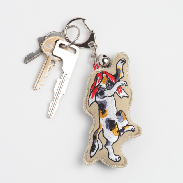 KY42-212/みけま。尻尾が割れた魔の三毛猫。手ぬぐいを頭に。綿入りのキーホルダーです。