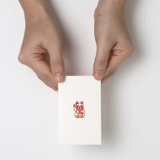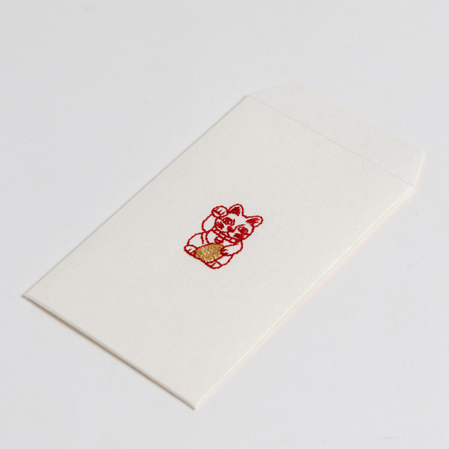 岐阜県で漉かれる美濃和紙に、刺繍をほどこしました。繊維がよく絡まった和紙だからこそ、刺繍をうつことができました。中身が透けないように、紙の厚さを特注しています。右手を上げているものはお金や幸運を招きます。