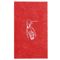 福井県で漉かれる越前和紙に、刺繍をほどこしてあります。繊維がよく絡まった和紙だからこそ、刺繍を入れることができました。赤く染めてから漉いてもらっています。腰が曲がっている海老は長寿を象徴する縁起物。