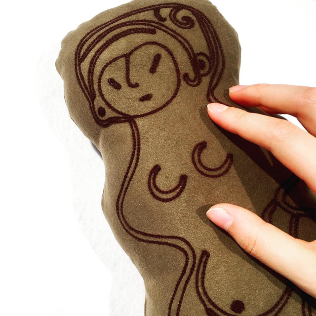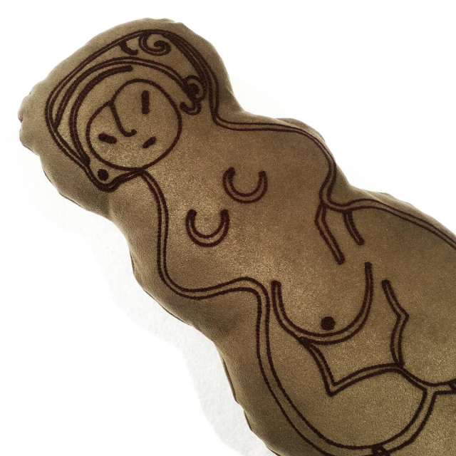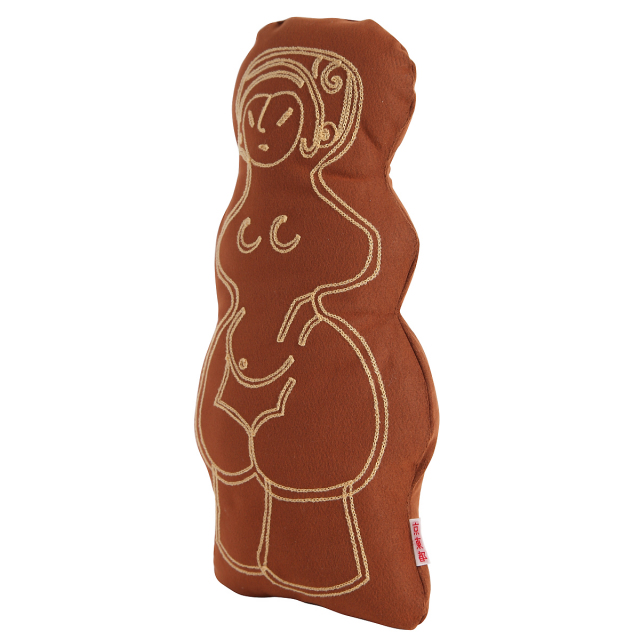 KY84-499/土偶をかたどったチェーン刺繍のミニクッション。※布地や刺繍糸の色はお選びいただけません。 縄文のビーナスは、長野県茅野市棚畑遺跡出土、国宝。妊婦を表しており美しい曲線を持つ。細かい雲母片が練りこまれているためにキラキラと輝いて見える。高さ27cm、重さ2.14kg。茅野市所蔵。茅野市尖石縄文考古館保管。®第4658286号