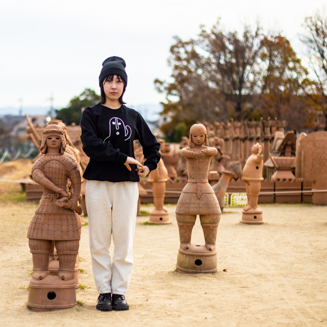 KY87-1139/1935年創業の墨田の国産Tシャツメーカー、久米繊維とのコラボトレーナー。良質な糸を厳選し国内で丁寧に編み上げ染色した、綿100%の裏パイルの生地は、素肌に心地よく洗いたてのタオルのような柔らかさ。ワキに縫い目が無いことで着心地を増す、丸胴タイプトレーナーは30年以上愛され続けている定番品です。 フロントに大きく踊る埴輪を刺繍しました。