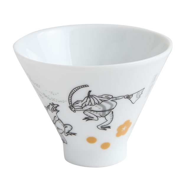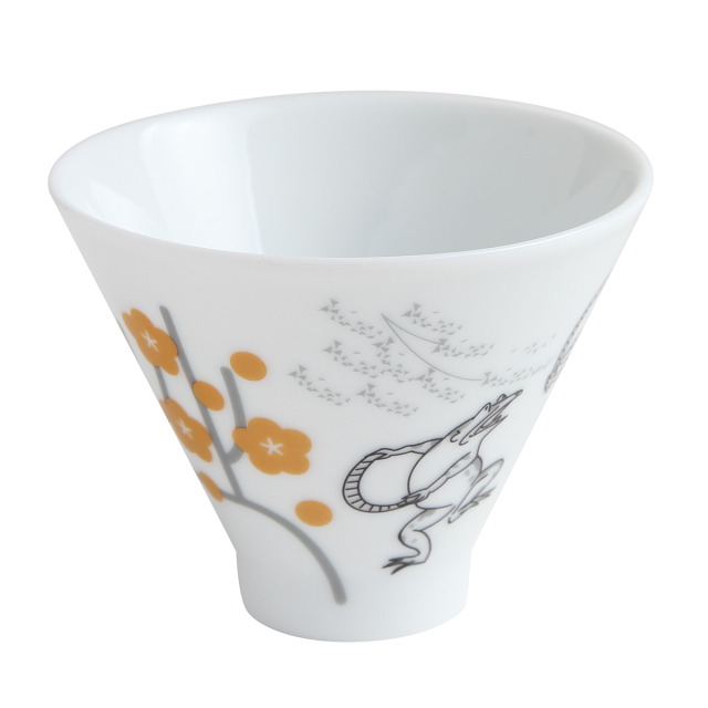 KY94-677/美濃焼の白磁の煎茶碗です。鳥獣人物戯画より、烏帽子をかぶった蛙と猫を、縁起柄である梅の模様と合わせました。 岐阜瑞浪の陶磁器メーカー「miyama」さんとのコラボ商品です。