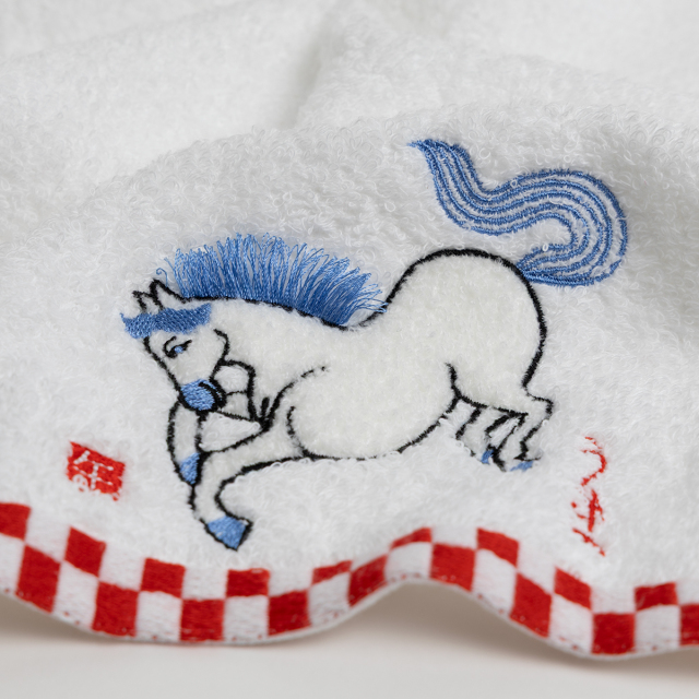 白地に馬の刺しゅうを施したハンドタオル。お手元や贈り物に、華やかさと縁起の良さをそっと添えます。