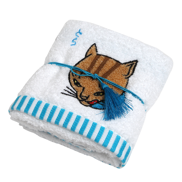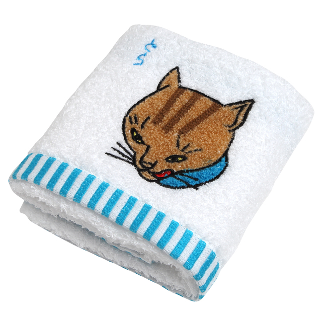 日本のタオル発祥の地、大阪・泉州の「泉州タオル」を使用した、ふわふわの刺繍入りハンドタオルです。猫部分にボリュームのあるサガラ刺繍を使いました。タオル地と一緒に猫感もお楽しみください。