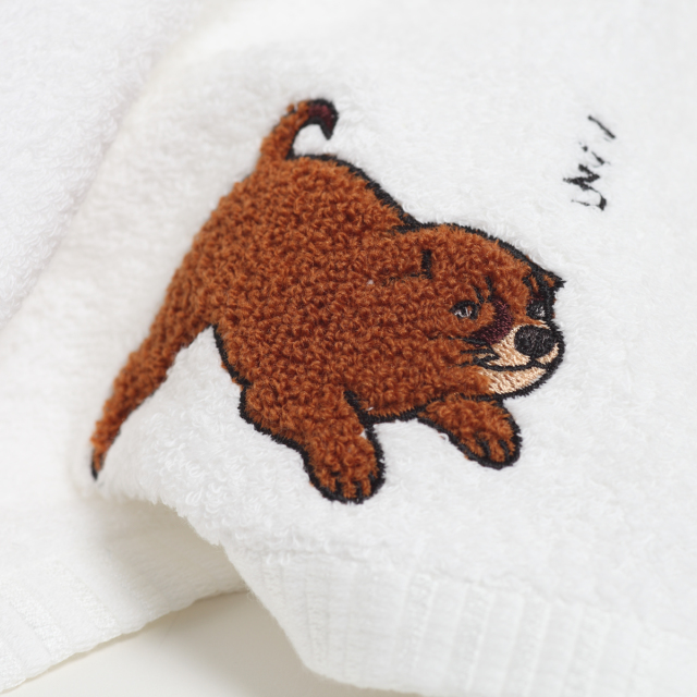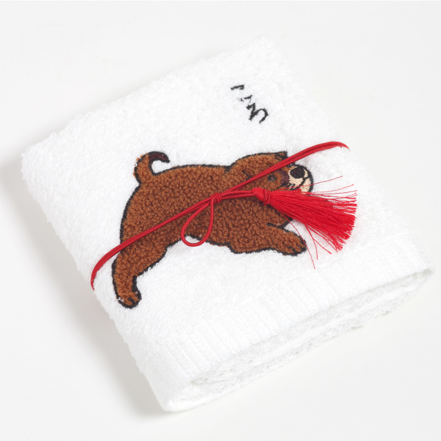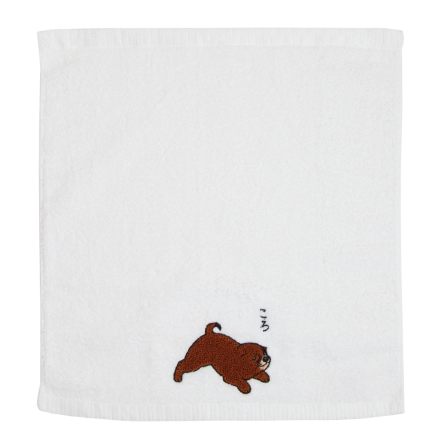KY95-776/ころころした茶色い仔犬をさがら刺しゅうしました。ハンドタオルは大阪の泉州タオルを使用しています。