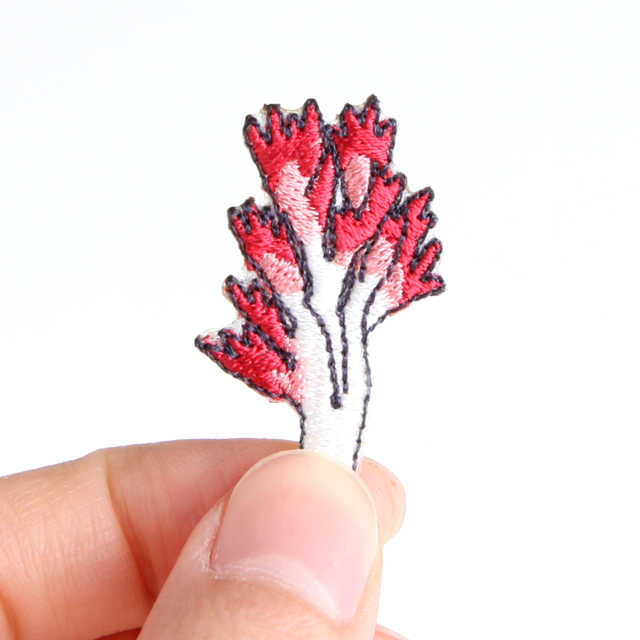 アイロンで付けられるワッペンです。白い石づきの部分にUV糸を使っています。綿やポリエステルの素材に使用いただけますが、圧着する素材自体が熱に弱い場合はご注意ください。