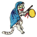 KYWS-111/老いた猫が妖怪に化けたもの。手ぬぐいを頭にかぶって踊っている。化け猫のなす怪異として、人間に化けたり、人間の言葉をしゃべるなど。特に白い猫が化けやすい。月から妖力を得ると言われ月を見上げる猫を特に恐れた。