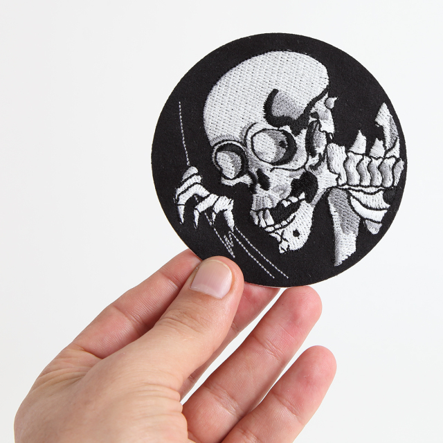 KYWS-804B/江戸時代の歌川国芳の浮世絵。御簾を破って大きく半身を乗り出す巨大な骸骨は、妖怪「がしゃどくろ」のイメージと重なっている。直径10cmの丸型のビッグワッペンは、キャップやデニムにつけてもインパクト大!